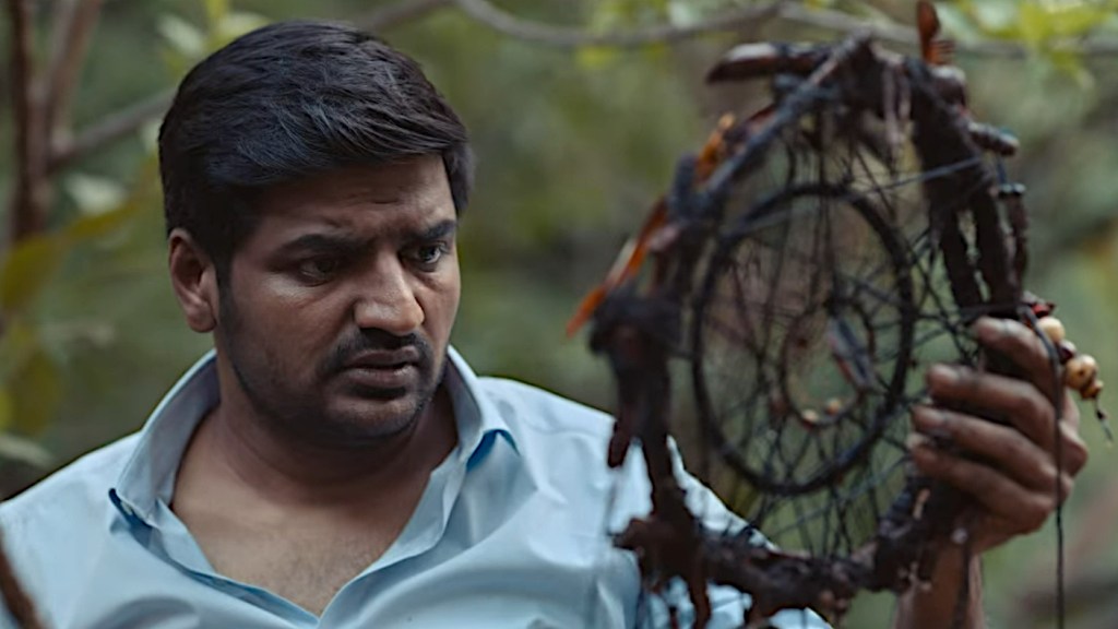 Conjuring Kannappan is a horror comedy about a hapless man, Kannappan, who finds an old dreamcatcher in a well. He pull a feather off the dreamcatcher as he’s extricating it from the well’s bucket, and that starts him down a dark path. He begins having a recurring nightmare about a house of horrors that has dangerous effects on Kannappan in the waking world. And soon, the people around him can’t help but pluck feathers off of the dreamcatcher themselves, threatening to trap them all together in the the same terrifying dream reality.